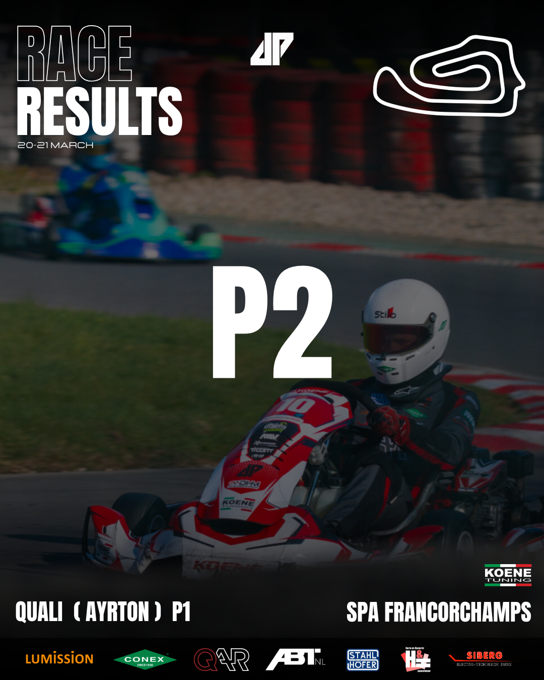 De eerste race dit seizoen werd gehouden op de kartbaan van Spa Francorchamps. Vanaf de trainings dag zat er al een goed tempo in en hadden we snel door dat we vooraan het veld mee moeten kunnen rijden. In de kwalificatie was Ayrton de snelste en zette hij ons neer op Pole Position. We hebben de hele race kunnen rijden in de top 4. Ongeveer op de helft van de race had ik een incident in de pitlane, waardoor we 25 seconde hadden verloren ten opzichte van onze eerdere pitstops. Het gebeurde doordat een rijder voor mij plotseling op de remmen ging net aan het begin van de pit-ingang. Ik remde, maar niet op tijd. Ik kwam ermee weg met een officiële waarschuwing. De rest van de race moesten we de verloren tijd goed rijden. We lagen 4e toen een team een straf van 5 rondes kreeg, waardoor we opschoven naar de 3e plek. De laatste paar rondes reed Ayrton met een rap tempo richting de tweede plek. In de één na laatste ronde haalde hij Donkervoort in, maar niet heel vlekkeloos. Het was echt vechten om de tweede plek, maar Ayrton wist hem te veroveren. Na de race kregen we een ronde straf, maar die werd al snel teruggetrokken. Hierdoor was het een geslaagd weekend met een Koene 1-2.